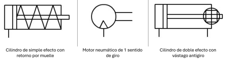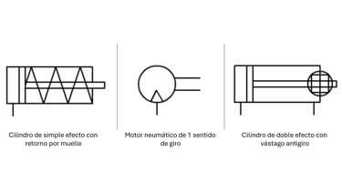 Finalmente los actuadores son los elementos más diversos dentro de la clasificación. Generalmente si son actuadores lineales representan el número de acciones (entradas de aire), número de vástagos y tipo de retorno, se muestran múltiples ejemplos a continuación. Y adicionalmente, los actuadores rotativos indican el sentido de giro según la entrada de aire y el fluido de trabajo.