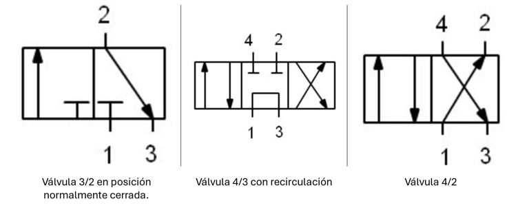 Comenzando con la simbología de las válvulas, estas se componen de vías (número de vectores dentro de los recuadros) y posiciones (número de recuadros). De esta manera se puede identificar la lógica y estados de estás válvulas de manera efectiva. Tres ejemplos de estos elementos se ven a continuación: