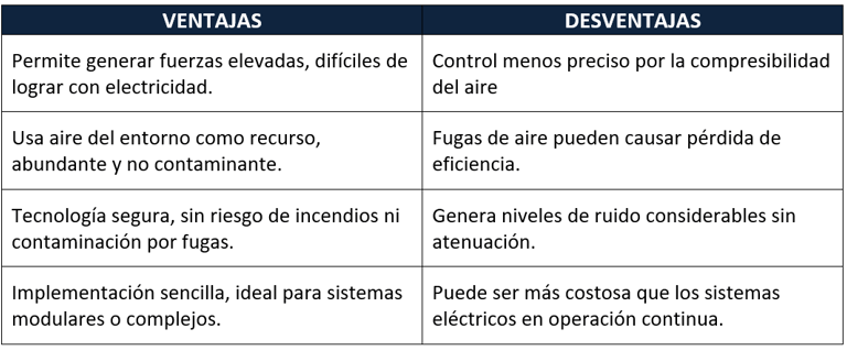 La elección de un sistema neumático frente a uno eléctrico o hidráulico depende de múltiples factores. A continuación, se resumen algunas de sus ventajas y desventajas más relevantes: