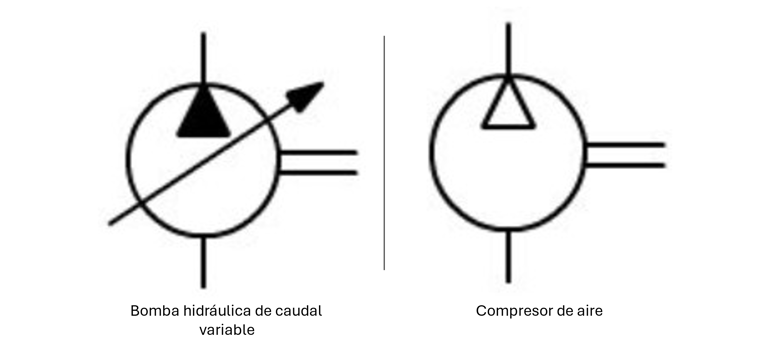 Por otra parte, los compresores (y bombas si se maneja algún líquido) se representan con secciones redondas, definiendo las direcciones por las cuales circula el aire y otras especificaciones como el control de estos.