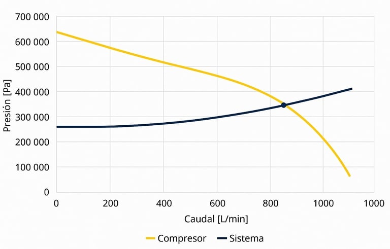 Esto permite trazar la curva de carga y verificar si el compresor seleccionado opera en su zona eficiente. Como se puede observar en la siguiente figura: